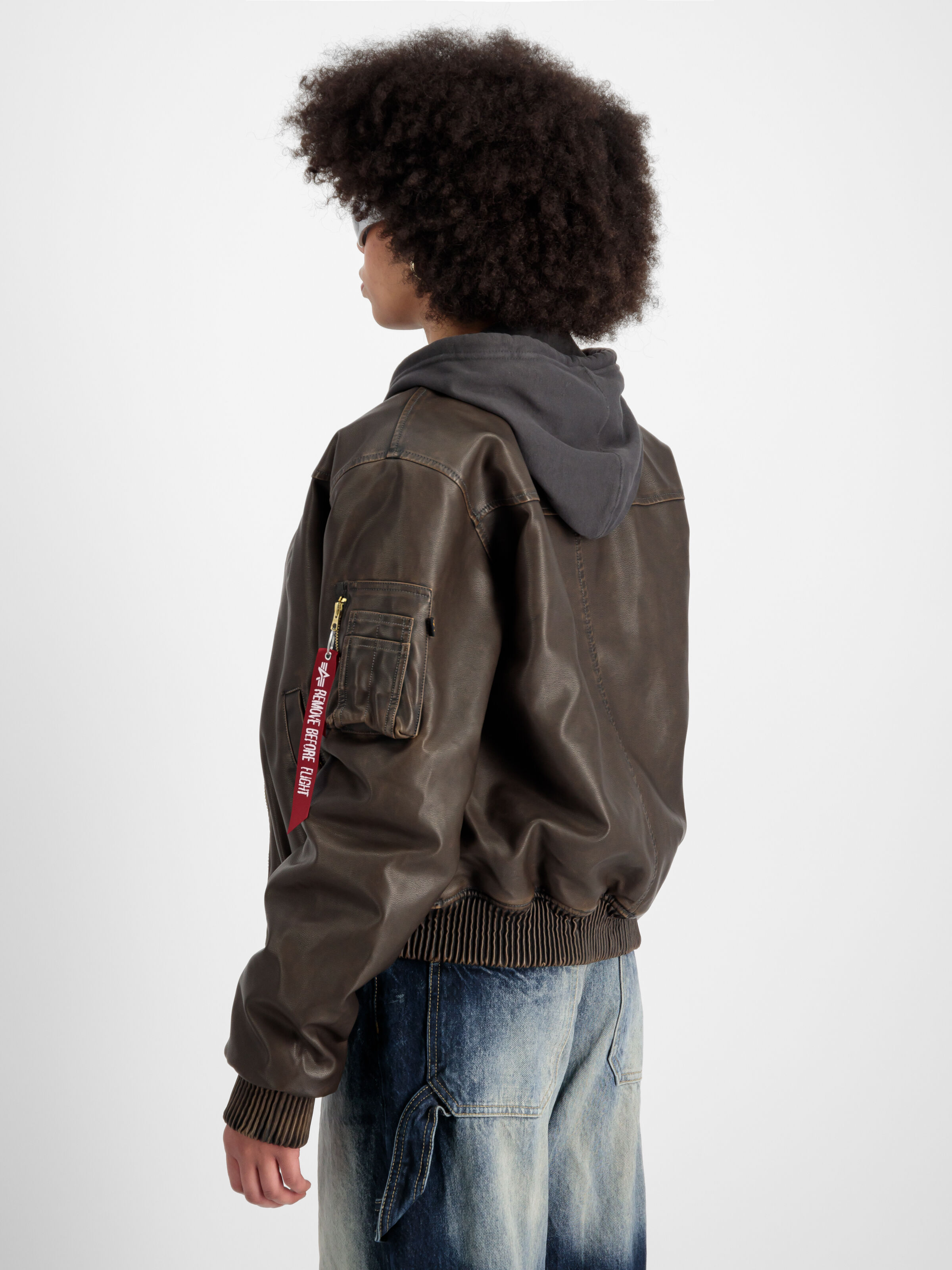 The utility pocket and RBF tag are prominent touches that not only add to its functionality but also enhance its vintage aesthetic appeal. These details are subtle yet effective in capturing the essence of authentic bomber jackets.